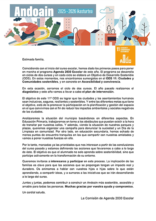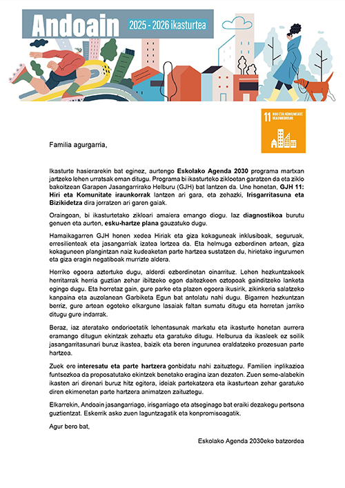 Hasteko, gurasoei zuzendutako gutuna duzue, euskaraz eta gazteleraz, ikasturte honetako jarduna aurkeztuz.